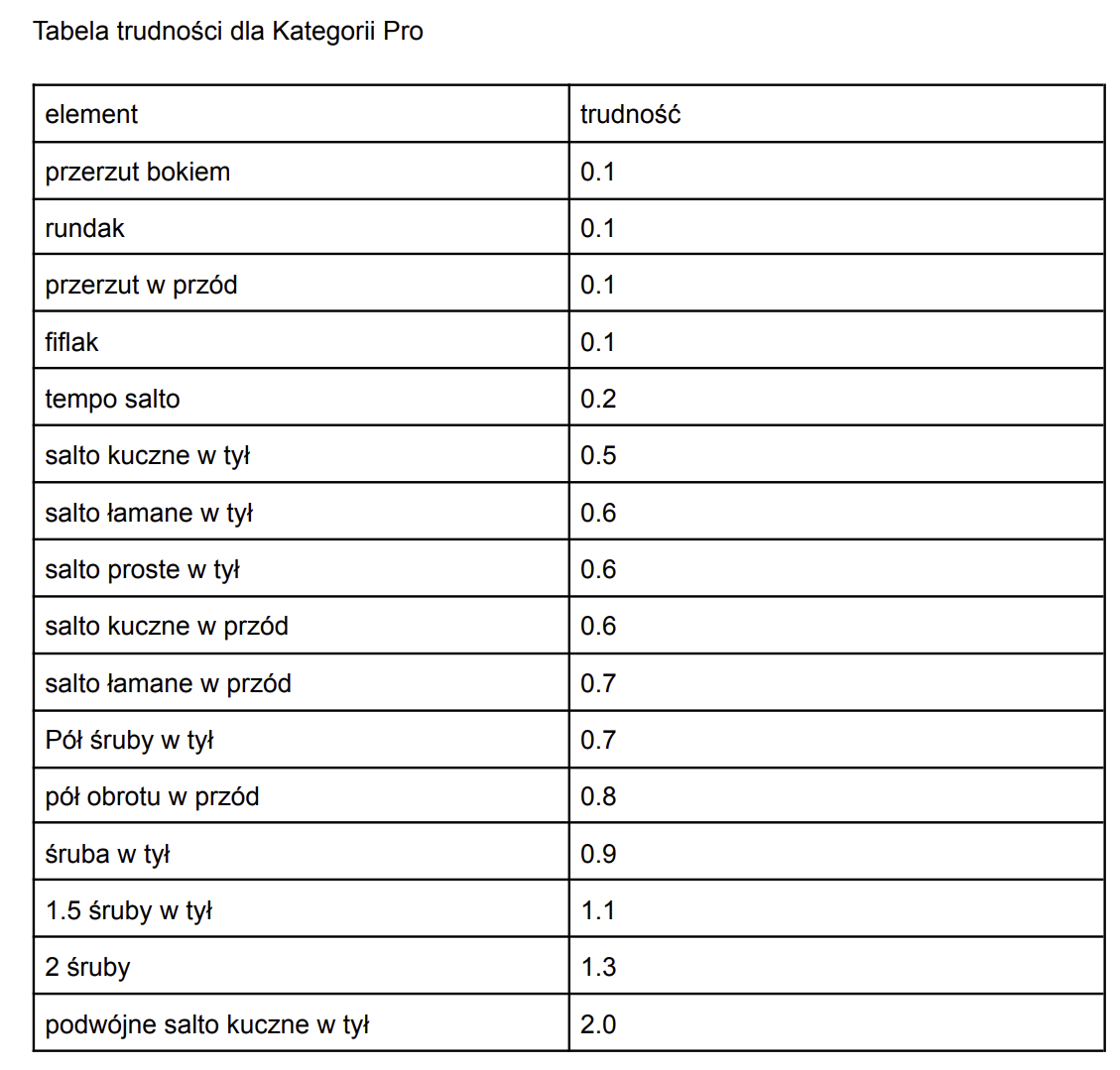 • Rundak + fiflak/ salto kuczne w tył – (do wyboru – ocena wg tabeli PZG zamieszczonej na dole strony)